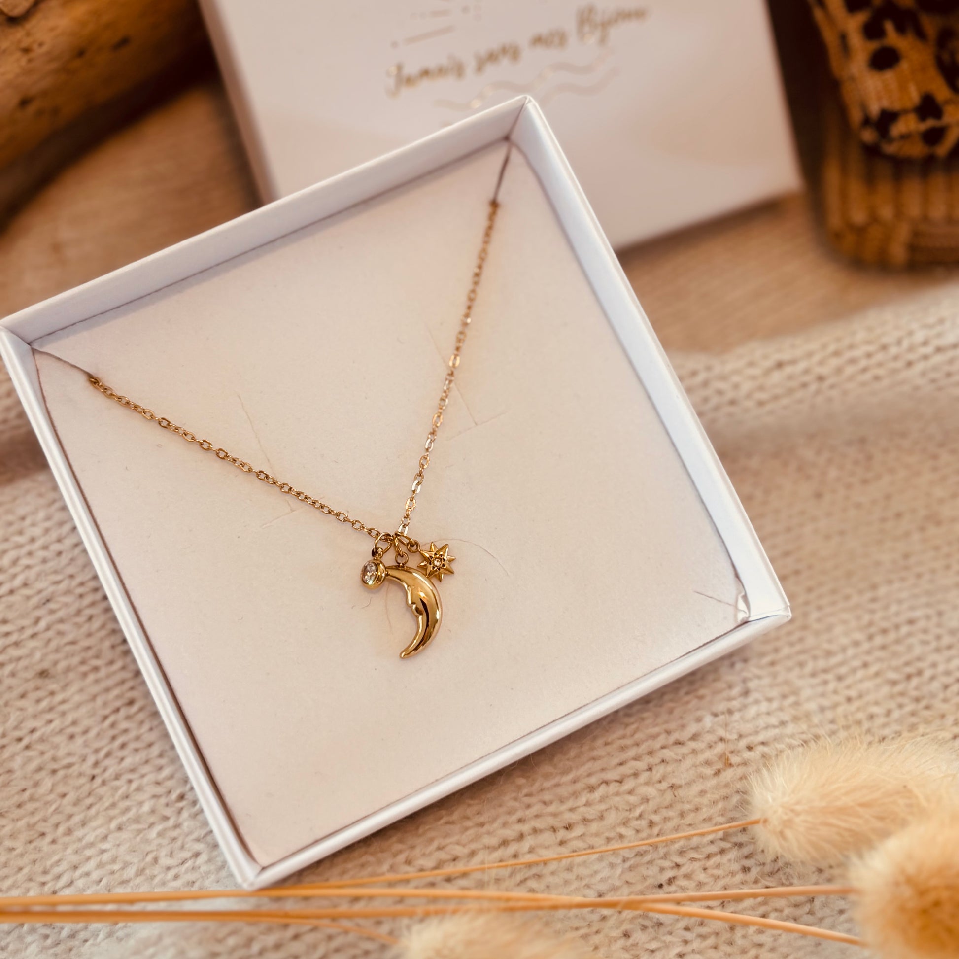 - Fermoir mousqueton + chaînette afin d'ajuster la longueur.